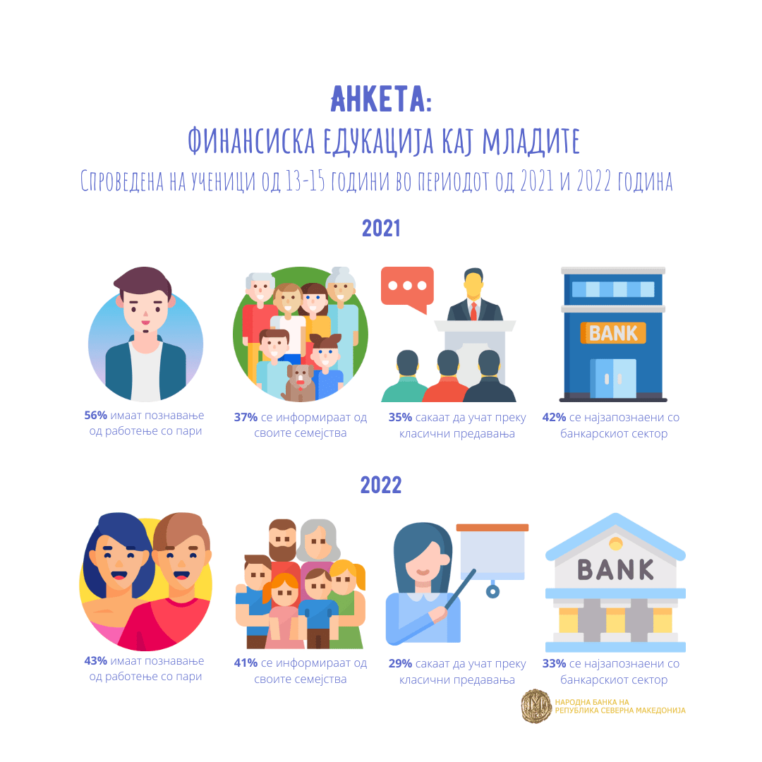 Околу половина од младите помеѓу 13 и 15 години сметаат дека не располагаат со доволно знаење за управувањето со парите. Најголемиот дел од нив учат за управувањето со парите од своите семејства. Од финансискиот систем, најдобро ги познаваат функциите на банкарскиот сектор и сметаат дека најдобро можат да се стекнат со финансиски знаења преку класичната настава. Ова го покажуваат резултатите од Анкетата на Народната банка спроведена во 2021 година и првата половина од 2022 година. Според наодите, Народната банка продолжува со своите едукативни активности, а воедно создава и нови алатки во форма на предавања, презентации и едукативни материјали.