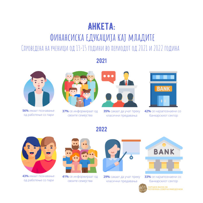 Околу половина од младите помеѓу 13 и 15 години сметаат дека не располагаат со доволно знаење за управувањето со парите. Најголемиот дел од нив учат за управувањето со парите од своите семејства. Од финансискиот систем, најдобро ги познаваат функциите на банкарскиот сектор и сметаат дека најдобро можат да се стекнат со финансиски знаења преку класичната настава. Ова го покажуваат резултатите од Анкетата на Народната банка спроведена во 2021 година и првата половина од 2022 година. Според наодите, Народната банка продолжува со своите едукативни активности, а воедно создава и нови алатки во форма на предавања, презентации и едукативни материјали.