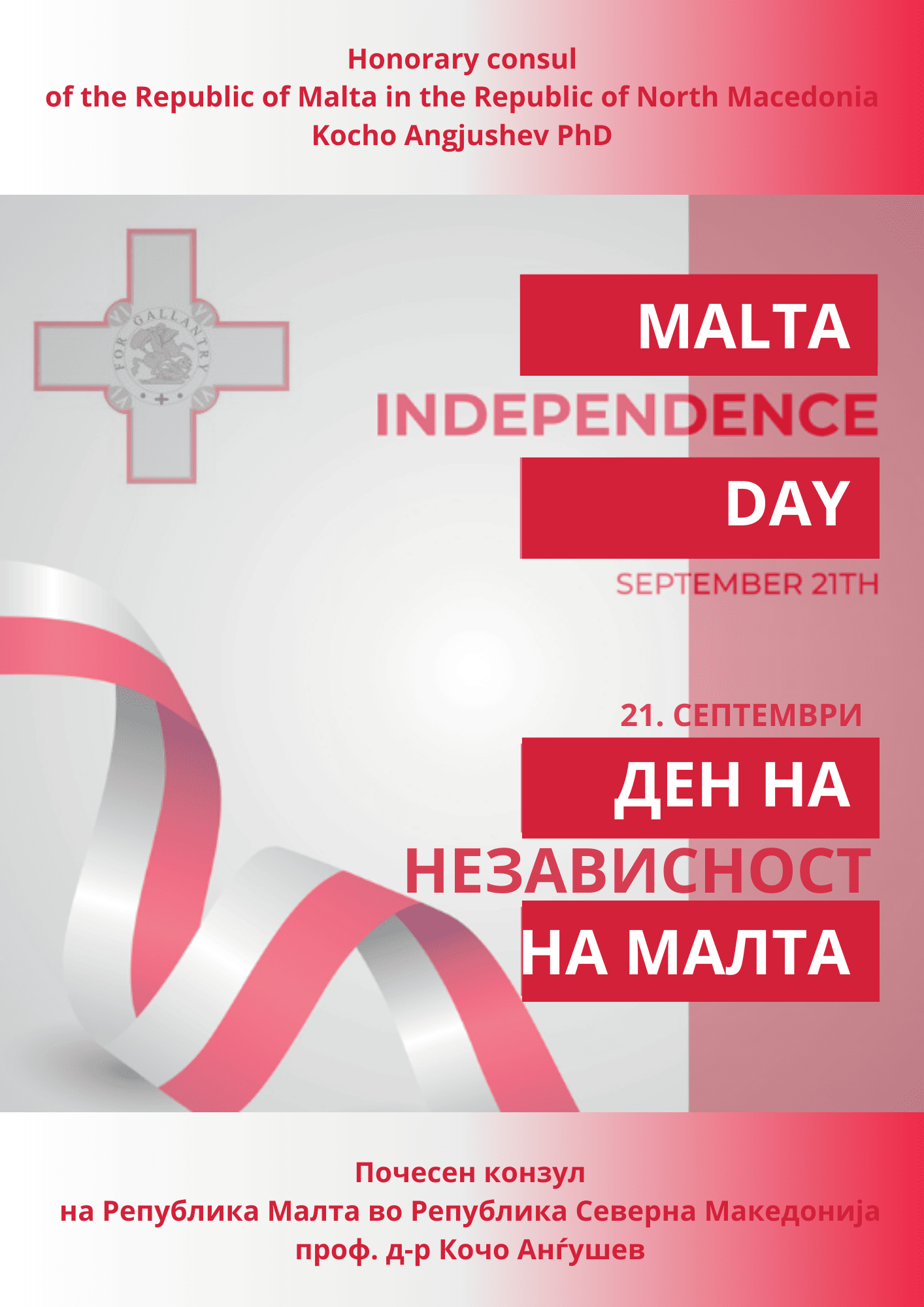 Почесниот конзул на Малта во Северна Македонија, проф. д-р Кочо Анѓушев, го честита Денот на независноста на Малта, која годинава одбележува 59 години независност од Обединетото Кралство, стекната во 1964 година.