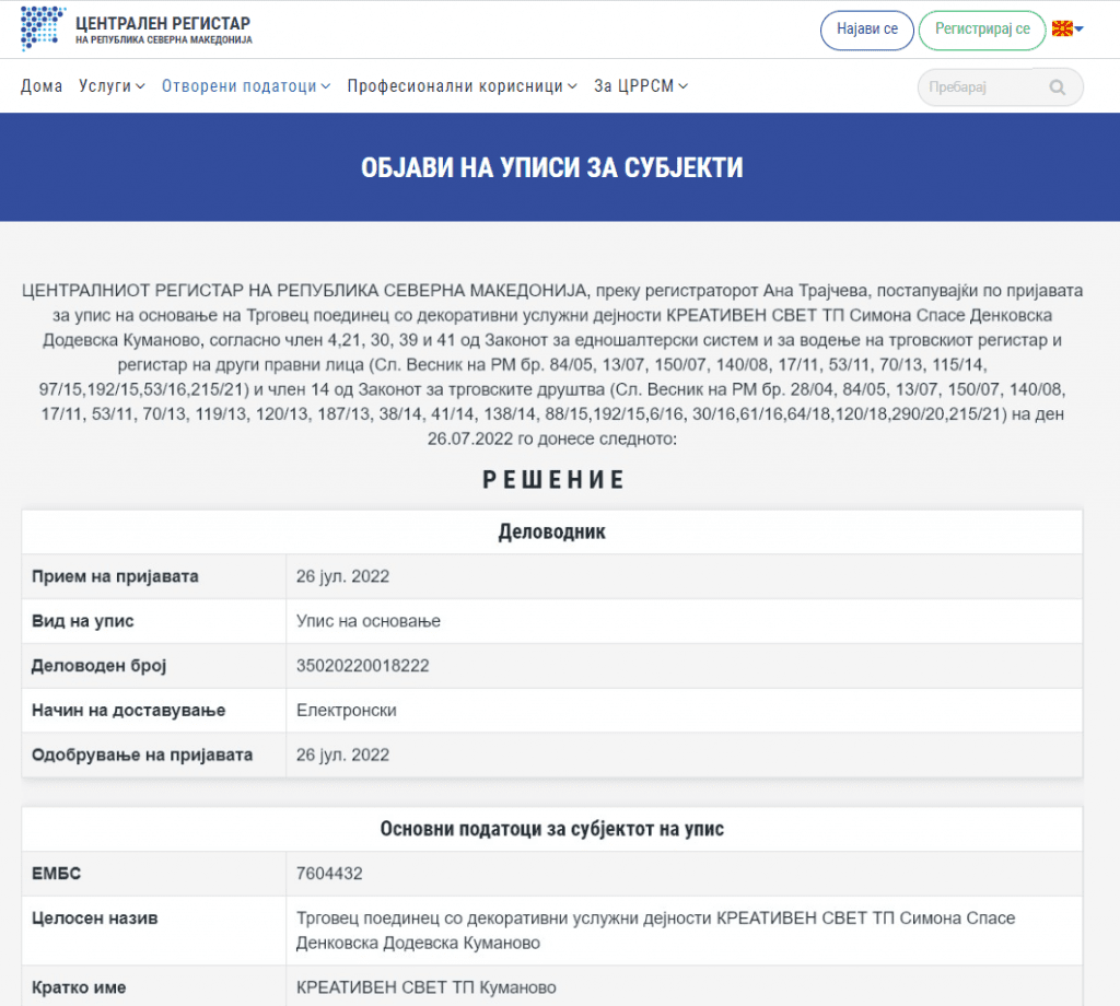 Пример за бесплатна објава на интернет-страницата на Централниот регистар на РСМ