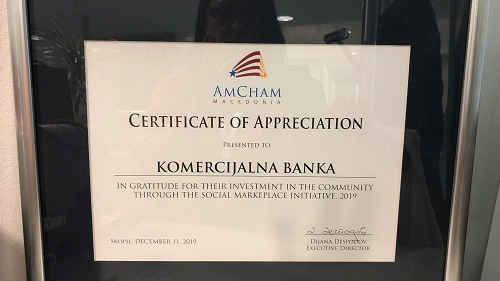 AmCham Macedonia и додели Благодарница на Комерцијална банка АД Скопје за инвестиции во општеството во 2019 година преку иницијативата Social Marketplace. Банката преку Координативното тело за општествена одговорност финансиски го поддржа проектот „Урбана градина во Ресен“ на Здружението за рурален развој „Локална акциона група Преспа“.