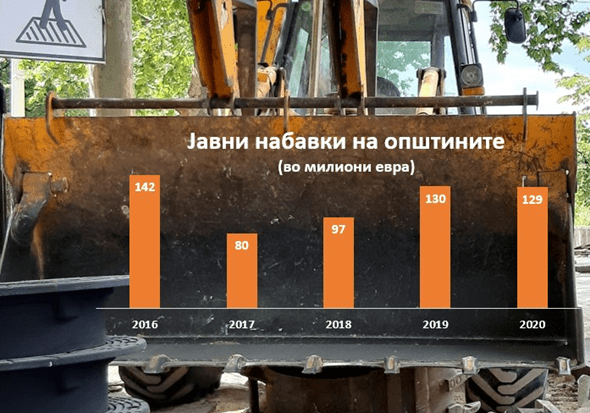 Центарот за граѓански комуникации (ЦГК) ја објави Базата на податоци за јавни набавки на општините во 2020 година според која 80-те општини и Градот Скопје склучиле 3.454 договори за јавни набавки во вкупна вредност од околу 8 милијарди денари, односно 129 милиони евра, скоро исто колку и претходната 2019 година.