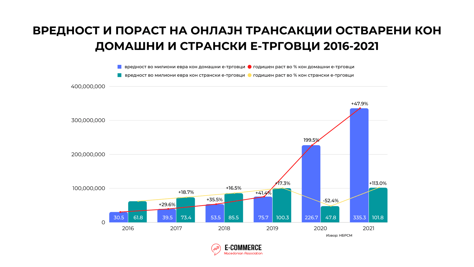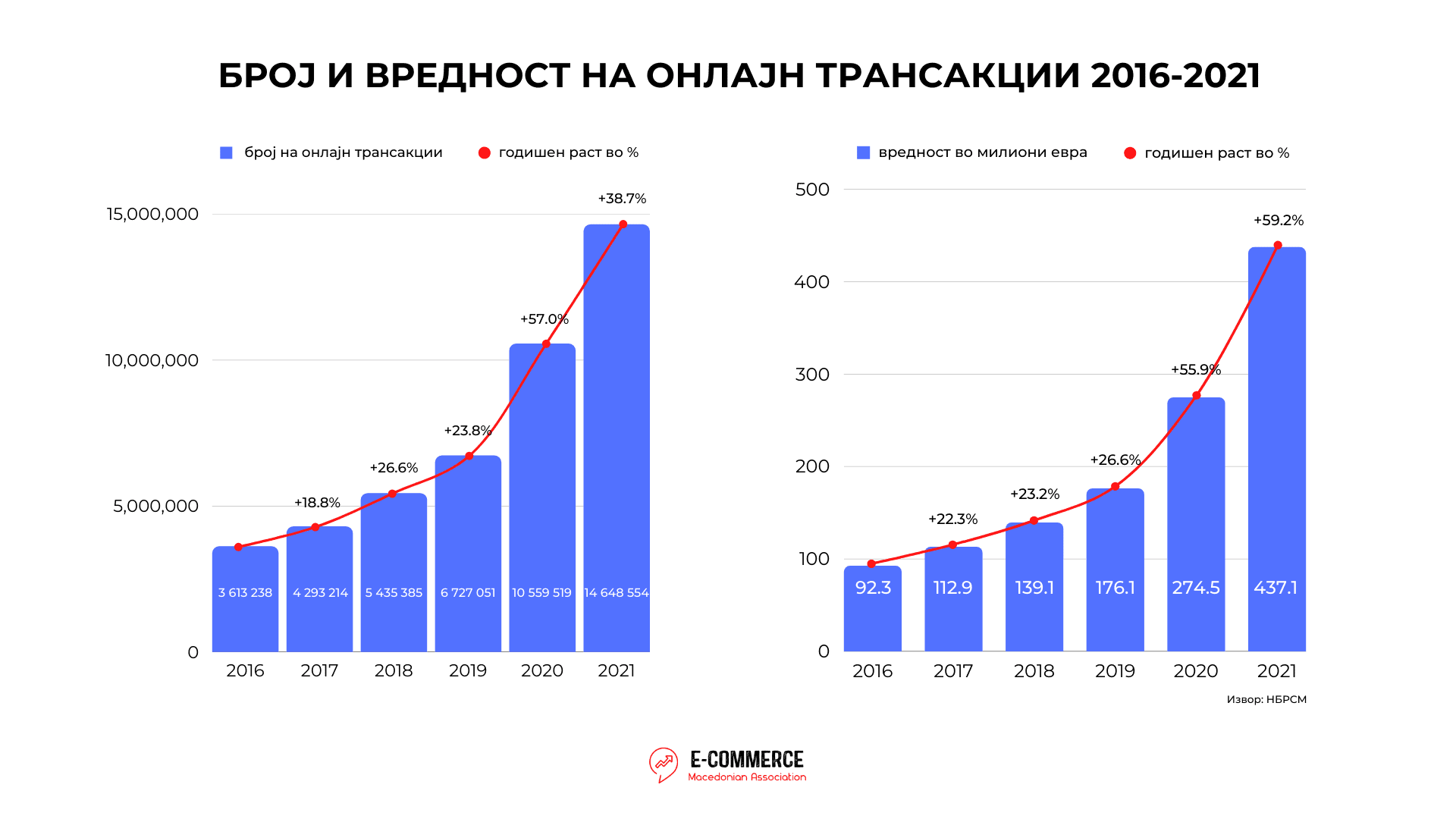 На графикот подолу е прикажан растот на бројот и вредноста на онлајн трансакциите по години, за периодот од 2016 заклучно со 2021 година. Од аспект на бројот на онлајн трансакции може да се забележи дека значајно отстапување има токму во 2020 година, која беше пандемиска година со 57% раст, додека во 2021 година растот продолжува, но со намалено темпо и истиот изнесува 38,7%.
