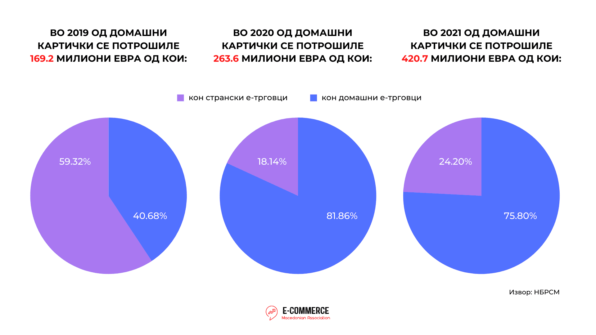 Согласно последните објавени податоци за платежна статистика од Народната Банка на Република Северна Македонија, кон домашните е-трговци се слеале 335,3 милиони евра во 2021 година што претставува раст од 47,9% споредено со 2020 година. Од нив 5% се реализирани со странски картички, додека 95% со домашни платежни картички.