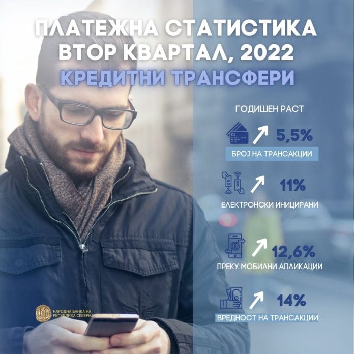 Граѓаните и понатаму ги користат придобивките од електронското банкарство при иницирањето на кредитните трансфери. Така, бројот на електронски иницираните кредитни трансфери во вториот квартал од 2022 година се зголемил за 11% на годишна основа. За извршување на плаќањата, граѓаните особено ги користеле мобилните апликации (раст од 19,9% на годишна основа), што повторно укажува на натамошно менување на навиките при извршувањето на плаќањата во прилог на користењето на дигиталните канали за плаќање.