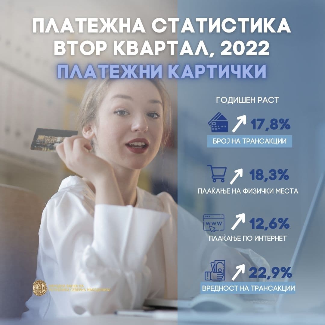 Плаќањата од страна на граѓаните во трговијата во земјата со платежни картички издадени од издавачи во земјата, во вториот квартал од 2022 година, забележаа годишен раст кај вредноста и бројот на остварените трансакции од 22,9% и 17,8%, соодветно. Притоа, бројот на извршени трансакции забележа годишен раст од 18,3% на физичките места на продажба, односно од 12,6%, на виртуелните (интернет) продажни места, во споредба со вториот квартал од 2021 година. Овие податоци укажуваат дека граѓаните и натаму сè повеќе ги користат дигиталните канали за вршење на плаќањата.