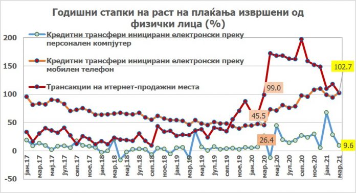 Сепак, од почнувањето на корона-кризата па наваму, заради потребата од заштита на јавното здравје, изолација и социјална дистанца, граѓаните сè почесто ги користеле придобивките на електронското банкарство при иницирањето на кредитните трансфери. Така, бројот на електронски иницираните кредитни трансфери во првиот квартал од 2021 година се зголемил за значителни 49% на годишна основа, што е повеќе за 2,3 пати во споредба со годишниот раст во истиот квартал во 2020 година (21%). За извршување на плаќањата, граѓаните особено ги користеле мобилните апликации, што укажува на натамошно менување на платежните навики во прилог на користењето на дигиталните канали за плаќање.