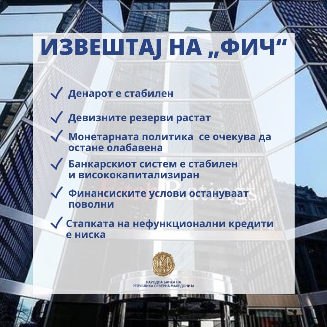 Во извештајот е нагласено сведувањето на основната каматна стапка на историски најниското ниво и очекувањето на „Фич” за олабавена монетарна политика на Народната банка и во следниот период, во отсуство на зголемување на стапката на инфлација во текот на следната година и во отсуство на натамошни притисоци врз домашниот девизен пазар.