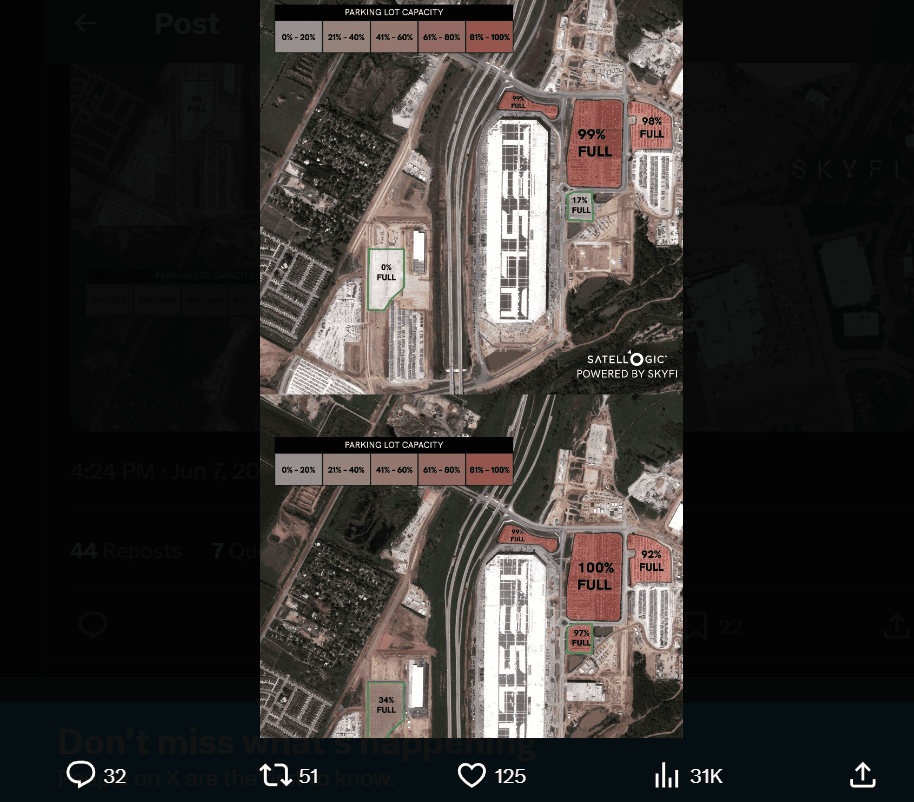 Сателитските снимки, обезбедени од SkyFi, покажуваат дека овие непродадени возила не одат никаде. Тие седат неподвижни на паркинзите, чекајќи да бидат транспортирани до своето одредиште. Шервуд Њуз истакна слични ситуации низ целата земја, при што извештаите за вишок на залихи се чуваат на места како трговскиот центар Честерфилд во Сент Луис. Сателитските снимки на SkyFi од мај 2024 година покажаа речиси 500 Тесла возила паркирани таму.