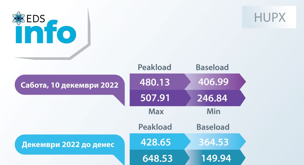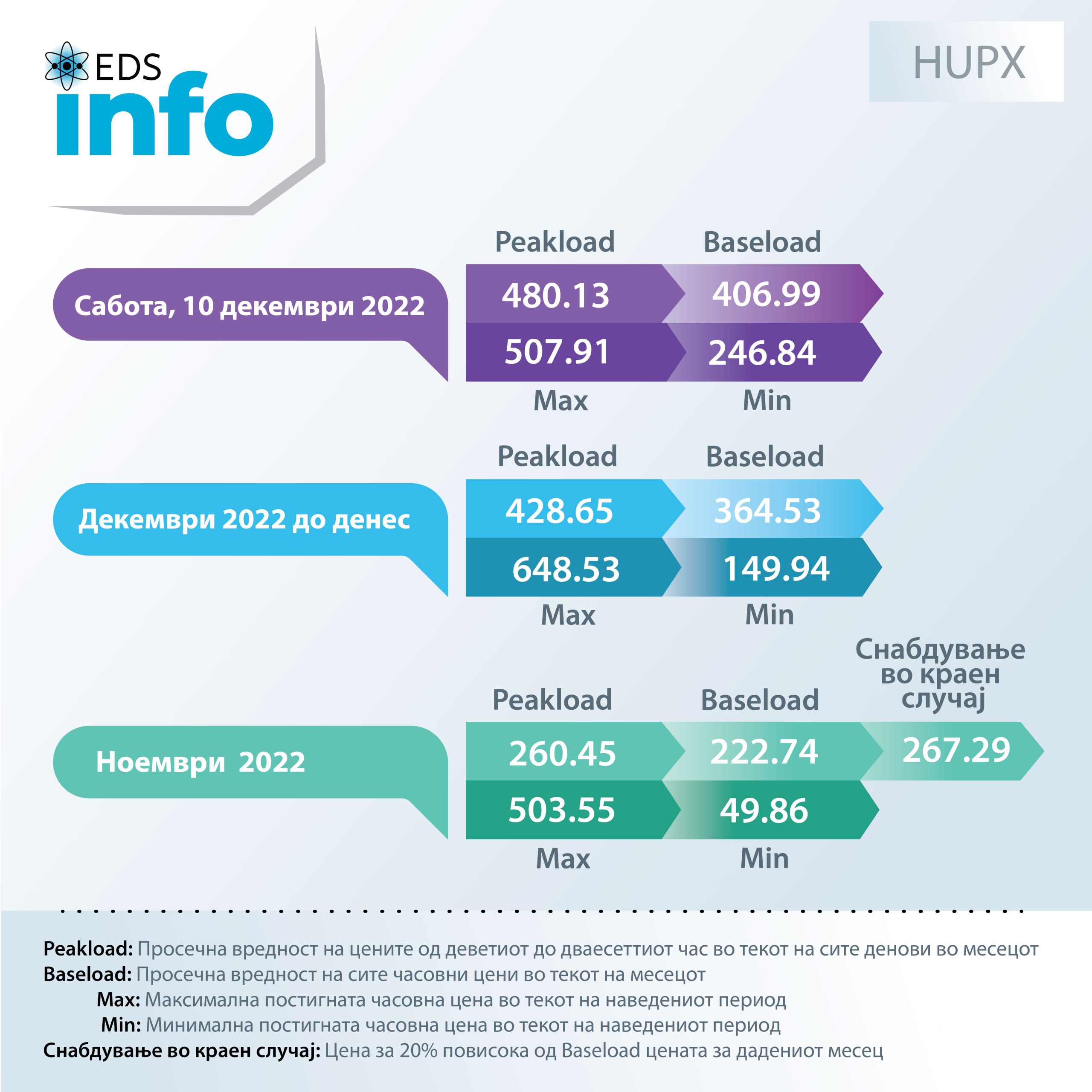 Согласно податоците за движењето на цените на берзата HUPX во Унгарија за 10 декември просечната часовна цена на еден мегават час електрична енергија (baseload) изнесува 406,99 евра/mwh.