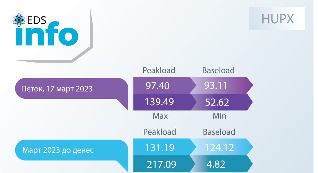 Согласно податоците за движењето на цените на берзата HUPX во Унгарија за 17 март просечната часовна цена на еден мегават час електрична енергија (baseload) изнесува 93,11 евра/mwh.