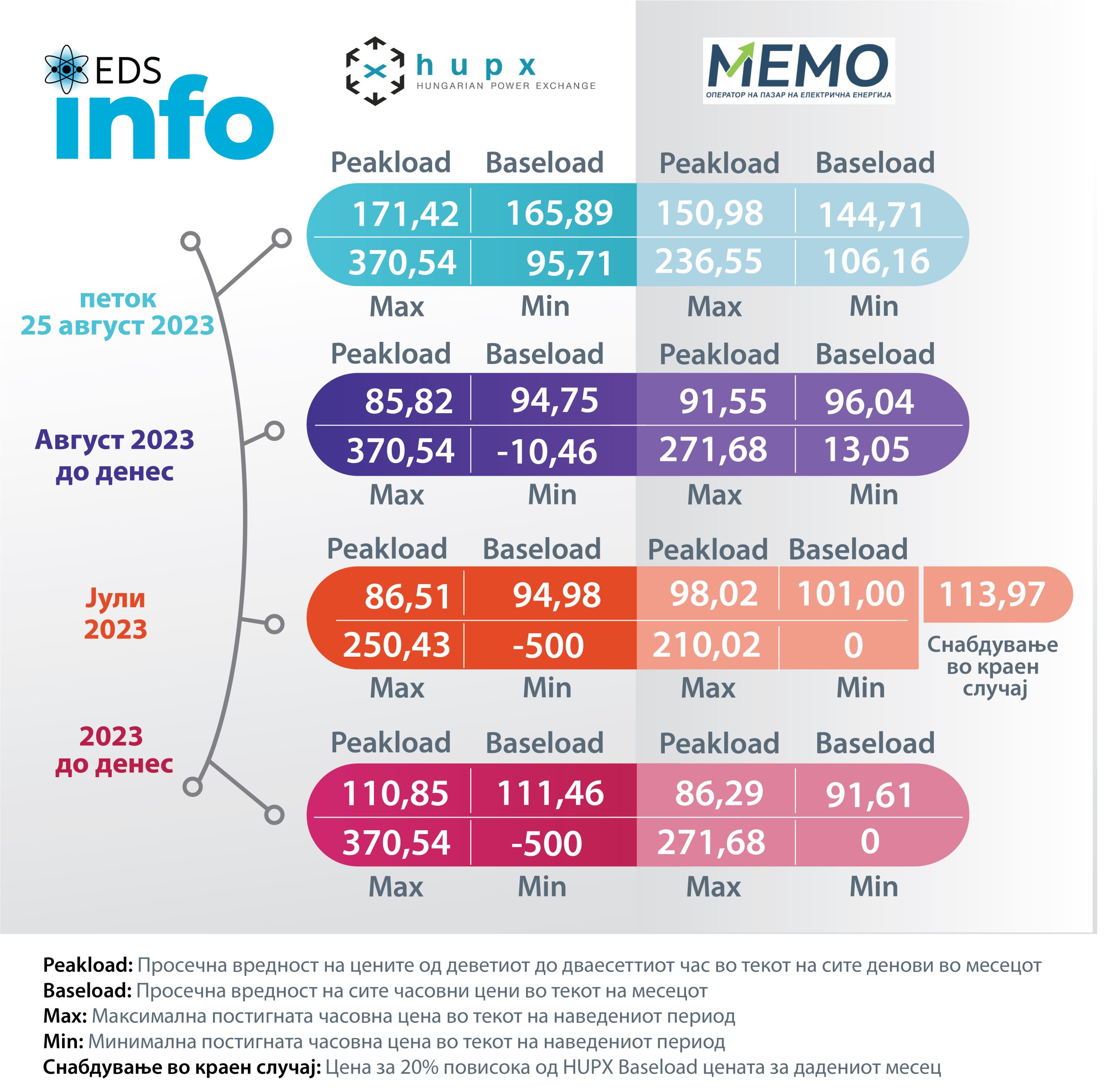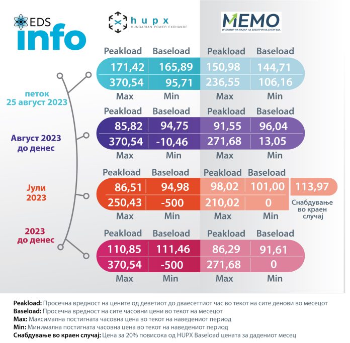 Согласно податоците за движењето на цените на берзата HUPX во Унгарија за 25  август просечната часовна цена на еден мегават час електрична енергија (baseload) изнесува  165,89  евра/mwh, додека на Македонската берза за електрична енергија цената е 144,71 евра/mwh