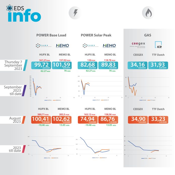 Согласно податоците за движењето на цените на берзата HUPX во Унгарија за 7 септември просечната часовна цена на еден мегават час електрична енергија (baseload) изнесува 99,72 евра/mwh, додека на Македонската берза за електрична енергија цената е 101,59 евра/mwh