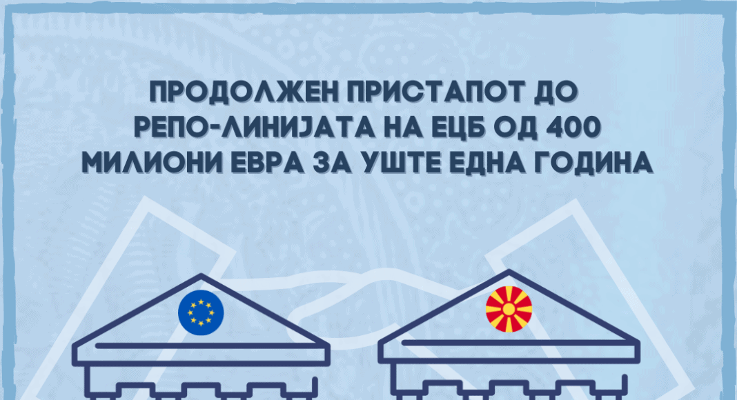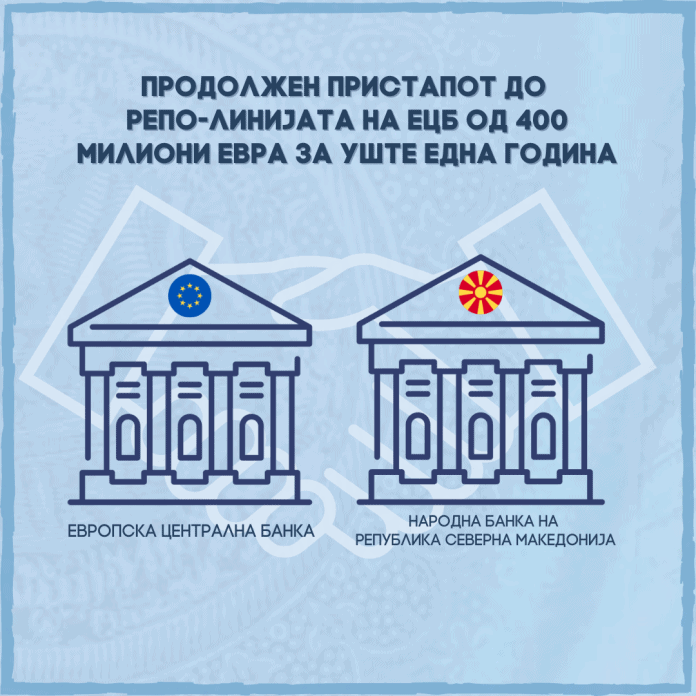Европската централна банка (ЕЦБ) донесе одлука со која се продолжува можноста за Народната банка за користење на репо-линијата до 15 јануари 2024 година, со што на нашата централна банка ѝ се става на располагање девизна ликвидност од 400 милиони евра за уште речиси една година. Репо-линијата е само уште еден заштитен слој, имајќи го предвид високото ниво на девизни резерви и високата ликвидност на банките, коишто ја гарантираат стабилноста на денарот и макрофинансиската стабилност. Пристапот за користење на овој инструмент претставува и значајна поддршка за политиките спроведувани од страна на нашата централна банка.
