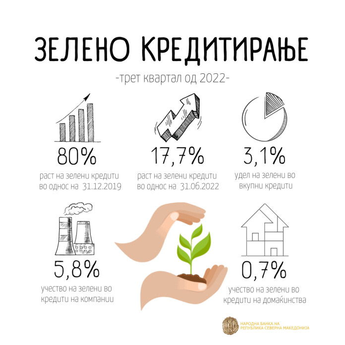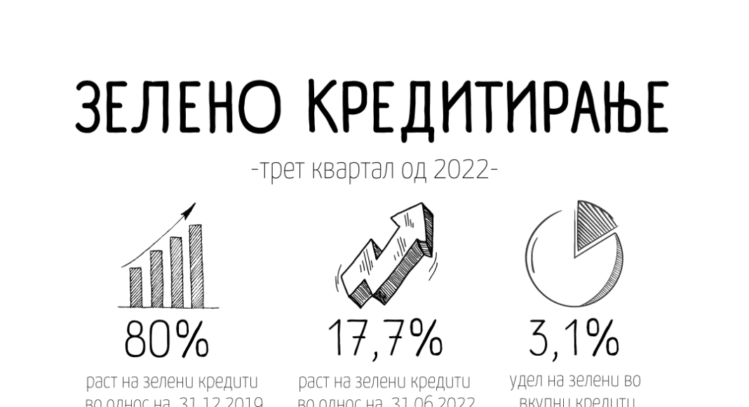 Забрзува растот на зеленото кредитирање во третиот квартал од 2022 година, достигнувајќи 17,7%%. Зелените кредити се наменети за проекти коишто поддржуваат одржливи, еколошки цели, или цели коишто придонесуваат за зелената транзиција во општеството, како што е развој на нова еколошка технологија. Во третиот квартал е зголемен и уделот на зелените кредити во вкупните кредити, од 2,7% во претходниот квартал, на 3,1%, односно за 0,4 процентни поени. Иако податоците покажуваат поволни поместувања, сепак има простор за понатамошно зголемување на уделот на зелените во вкупните кредити.