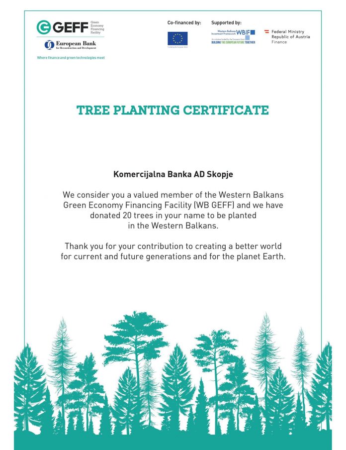 Со понудата на кредити од програмата WB GEFF (Western Balkans Green Economy Financing Facility) на ЕБОР и партнерските организации, Комерцијална банка овозможи голем број домаќинства во земјава да ги намалат потрошувачката на енергија и загадувањето на животната средина. Во знак на дополнително валоризирање на придонесот, ЕБОР во име на Комерцијална банка ќе донира 20 садници дрвја, кои во ноември годинава ќе бидат засадени низ земјите од Западен Балкан.