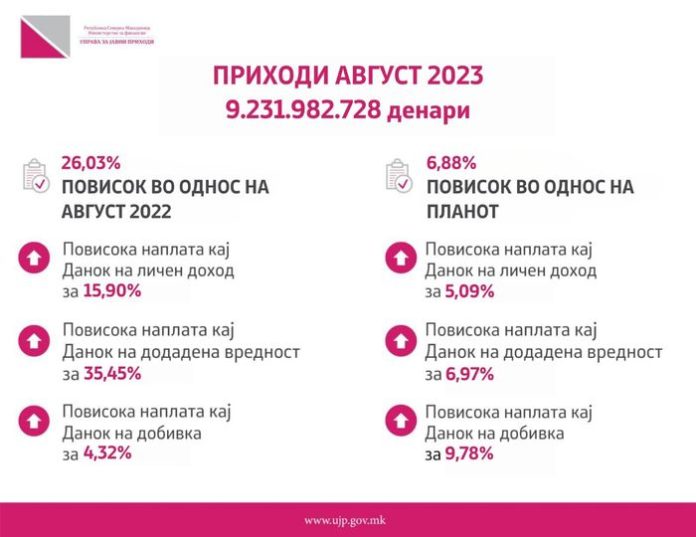 „Во месец  август 2023 година остварен е вкупен даночен приход од 9,23 милијарди денари што е за 26,03 проценти повисок приход во однос на истиот месец лани и за 6,88 насто повеќе од планираниот приход“, објави на својот Фејсбик профил директорката на Управата за јавни приходи, Сања Лукаревска.