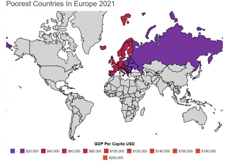 „Неколку европски земји се многу богати и се меѓу најбогатите на глобално ниво. Сепак, економскиот просперитет во Европа значително варира помеѓу државите. Земјите од Источна Европа, особено оние кои беа значително погодени по падот на Советскиот Сојуз се меѓу најсиромашните и денес“, пишува во алманахот во кој се објаснува дека Бруто домашниот производ (БДП) е една од најважните метрики што се користи за мерење на економското богатство на една земја.