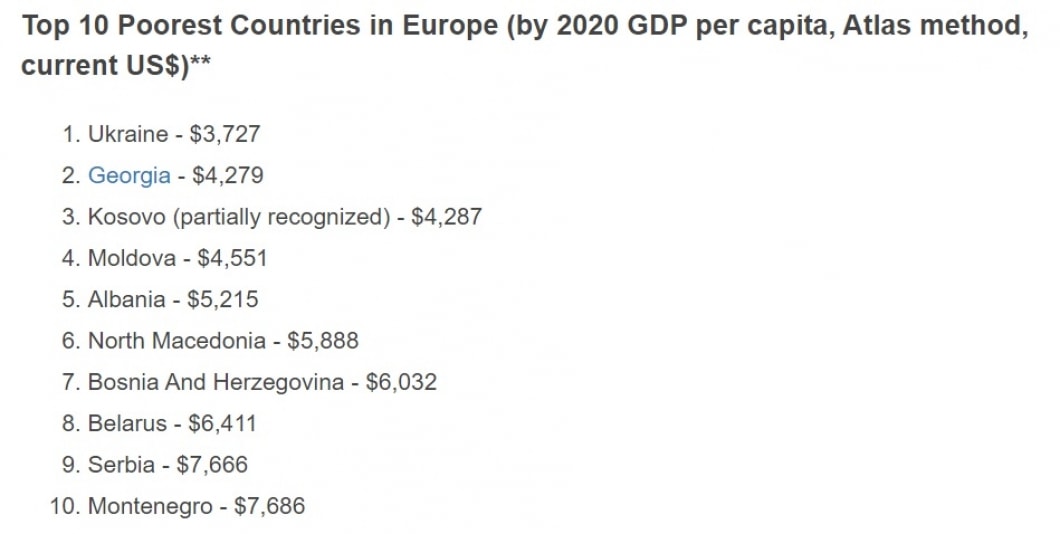 Според светскиот алманах (World Population Review) Македонија е на шестото место на ранг листата на 10 најсиромашни земји во Европа. После нас се Босна и Херцеговина, Белорусија, Србија и Црна Гора, а на врвот на листата се Украина, Грузија, Косово, Молдавија и Албанија.