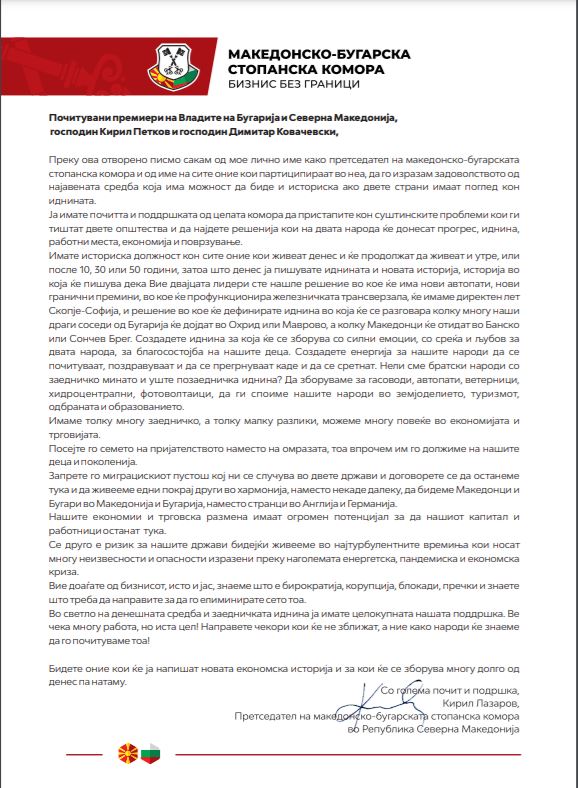 ,,Преку ова отворено писмо сакам од мое лично име како претседател на Mакедонско-бугарската стопанска комора и од име на сите оние кои партиципираат во неа, да го изразам задоволството од најавената средба која има можност да биде и историска ако двете страни имаат поглед кон иднината.