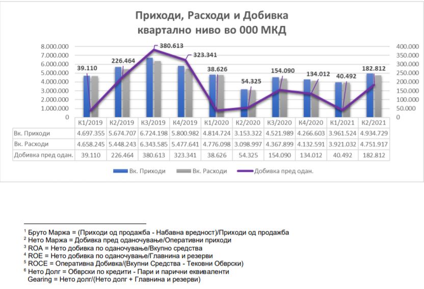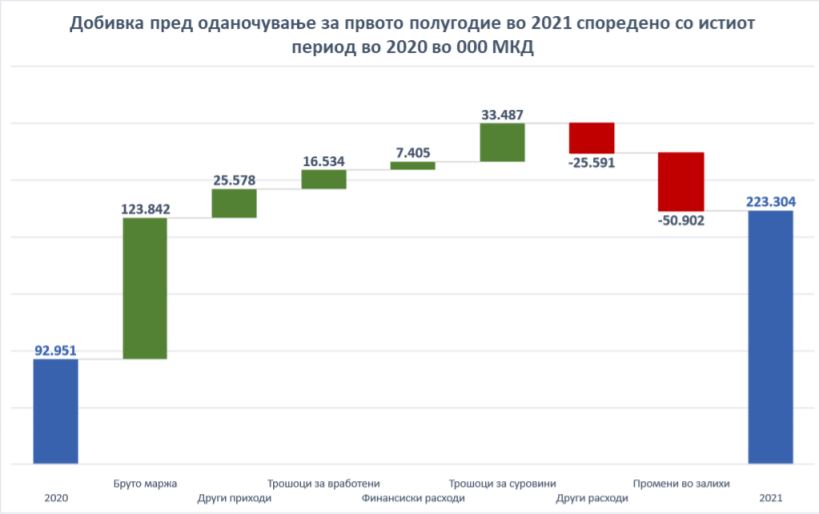 Како резултат на остварените приходи и расходи, на крајот на овој период, Друштвото оствари позитивни финансиски резултати искажани преку добивка пред оданочување во износ од 223,3 милиони денари која е поголема за цели 140,24%, односно, поголема за приближно 2,5 пати од остварената добивка минатата година кога изнесуваше 92,95 милиони денари. На графиконот подолу е прикажана добивката пред оданочување за првото полугодие во 2021- ва година, како и споредбата на позициите од билансот на успех со истиот период минатата година. Во истиот, со зелена боја, се прикажани позитивните движења, односно движења кои ја зголемуваат добивката, а со црвена боја се прикажани негативните, односно движења кои ја намалуваат добивката.