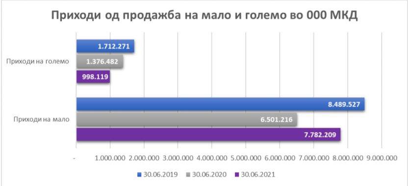 Порастот на приходите, споредбено со минатата година, во најголем дел се должи на зголемените приходи на мало за 19,7%, а истите учествуваат со 88,6% во приходите од продажба. Трендот на пораст на приходите на мало во извештајниот периодот, се должи на:
