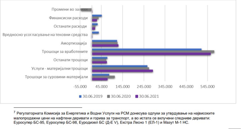 Вкупните расходи остварени во првото полугодие од 2021-ва година се во висина од 8,67 милијарди денари што претставува зголемување во однос на минатата година за 797,9 милиони денари или за 10,13%. Порастот во најголем дел се должи на зголемените расходи за набавна вредност на трговски стоки од 11,56%. Набавната вредност го следи трендот на приходите од продажба, што е неминовно со оглед дека истата во апсолутен износ е дел од приходите од продажба, односно зафаќа околу 85% од приходите. Расходите за набавна вредност на трговски стоки, односно набавните цени, се расходи врз кои Друштвото има лимитирано влијание. Истото се должи на регулирањето7 на најголем дел од набавните цени на нафтените деривати. Доколку набавната цена на одреден дериват не е регулирана, истата зависи од комплетно екстерни глобални фактори и движења, како што се цените на нафтените деривати на светските берзи и курсот на денарот во однос на доларот.