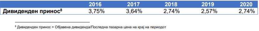 Друштвото во текот на периодот нема исплатено дивиденда. На XXV-тото Собрание на Акционери на Макпетрол АД Скопје, одржано на 26.05.2021, Друштвото донесе одлука бр. 0201- 28/2-3 за исплата на дивиденда за 2020-та година, во бруто-износ од 202.288.000 денари или 2.000 денари бруто по акција. Истата ќе се изврши најдоцна до 30.09.2021. Во табелата долу е прикажан дивидендниот принос во последните пет години.