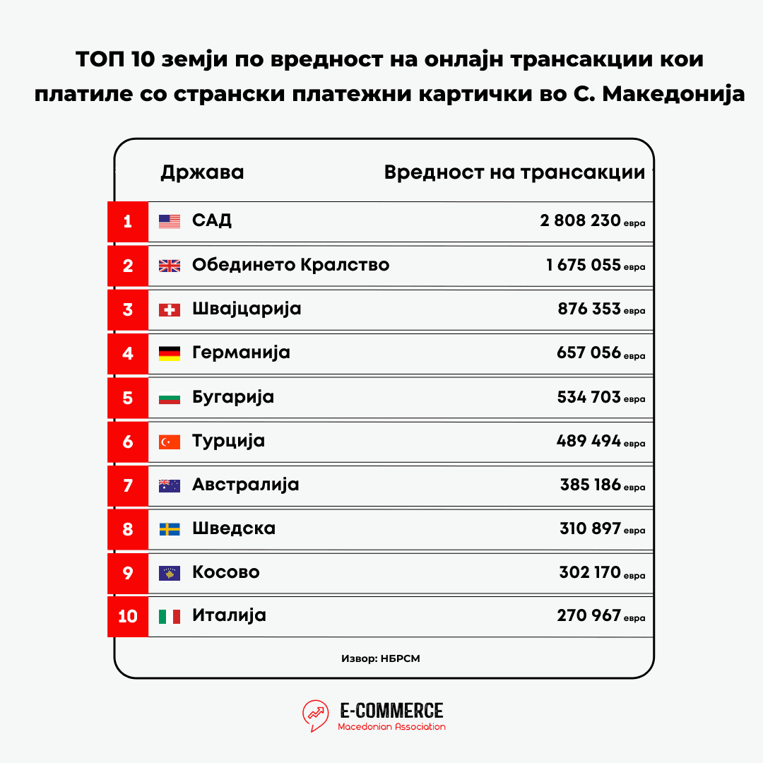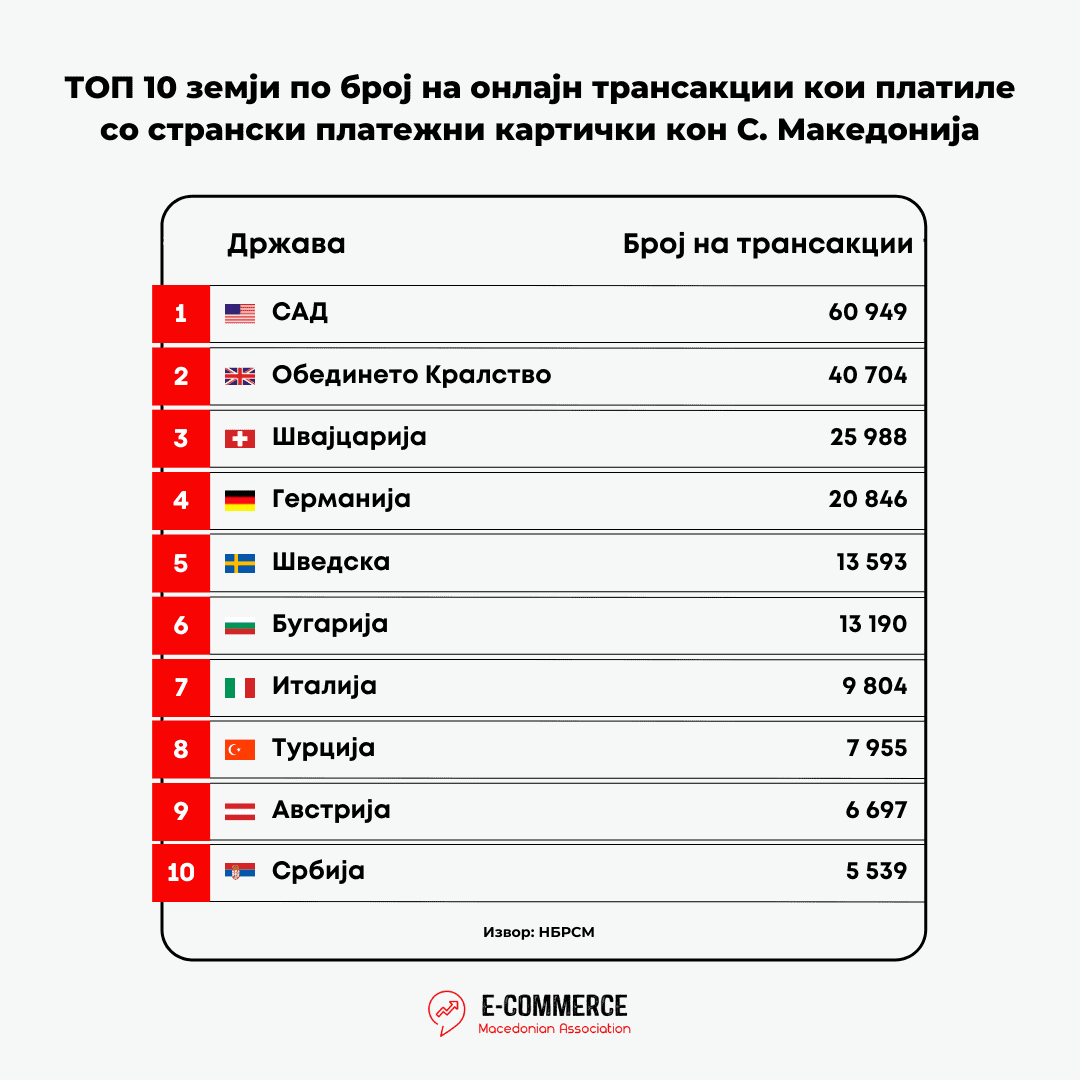 Од аспект на бројот на онлајн трансакции, направени со странски платежни картички во Македонија, 44,4% од трансакциите завршиле во корист на ТОП 10 земјите прикажани во табелата во продолжение. Најголем број на трансакции со странски платежни картички (60.949 трансакции) се реализирани со картички кои се издадени во САД, а потоа следи Обединетото Кралство со реализирани 40.704 онлајн трансакции.  Дел од ова веројатно се должи на странски картичките од брендови како “Payoneer” и “Revolut” од САД, односно Обединето Кралство кои воедно се користат од лица од земјава, особено лица од ИТ секторот кои работат “freelance” за странски компании и претставништва и по тој основ остваруваат приходи кои им се исплаќаат на странски картички, кои може да ги користат за трансакции кон дома.