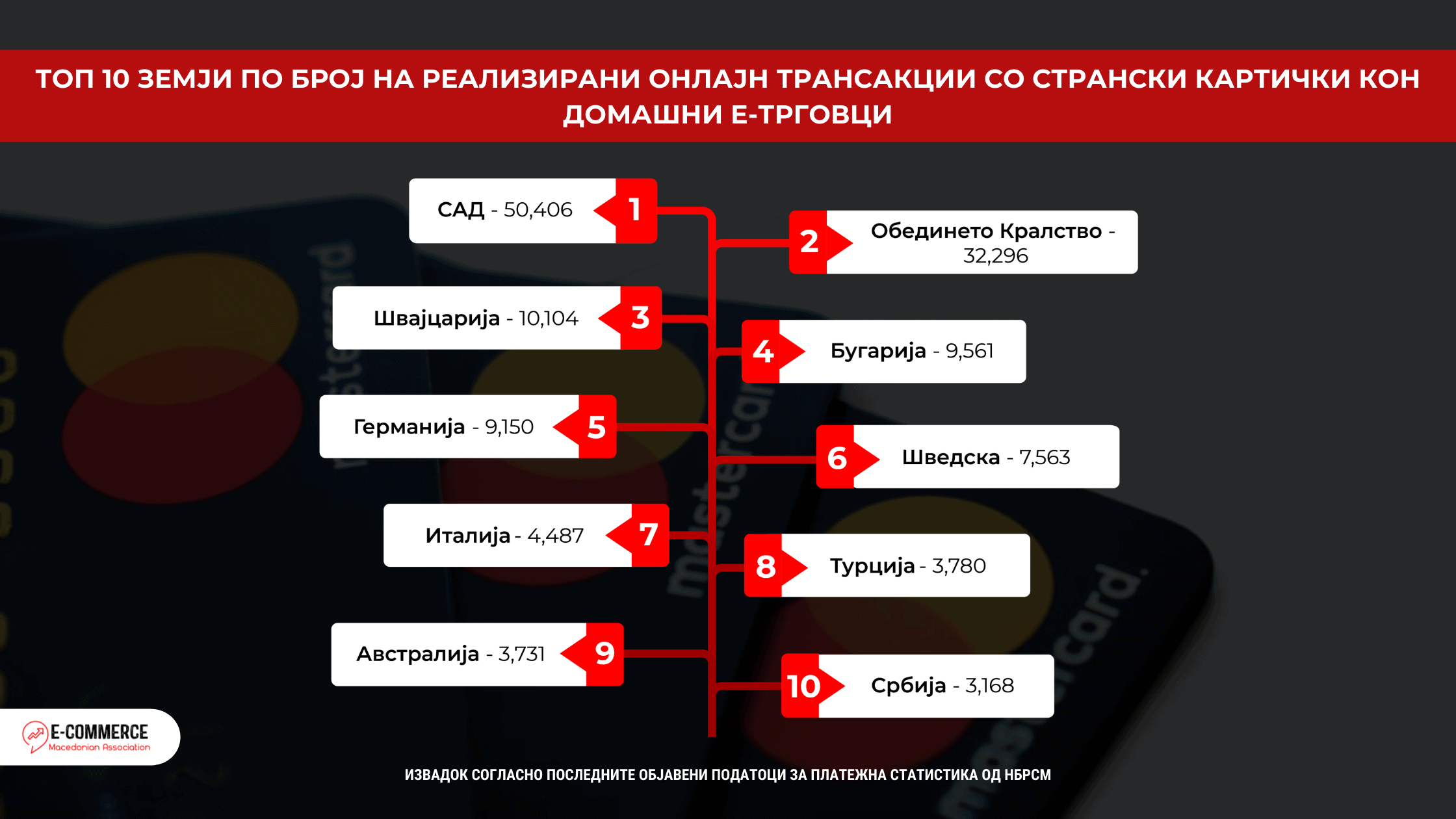 Најголем број на трансакции со странски платежни картички (50.406 трансакции) се реализирани со картички кои се издадени во САД, а потоа следи Обединетото Кралство со реализирани 32.296 онлајн трансакции.