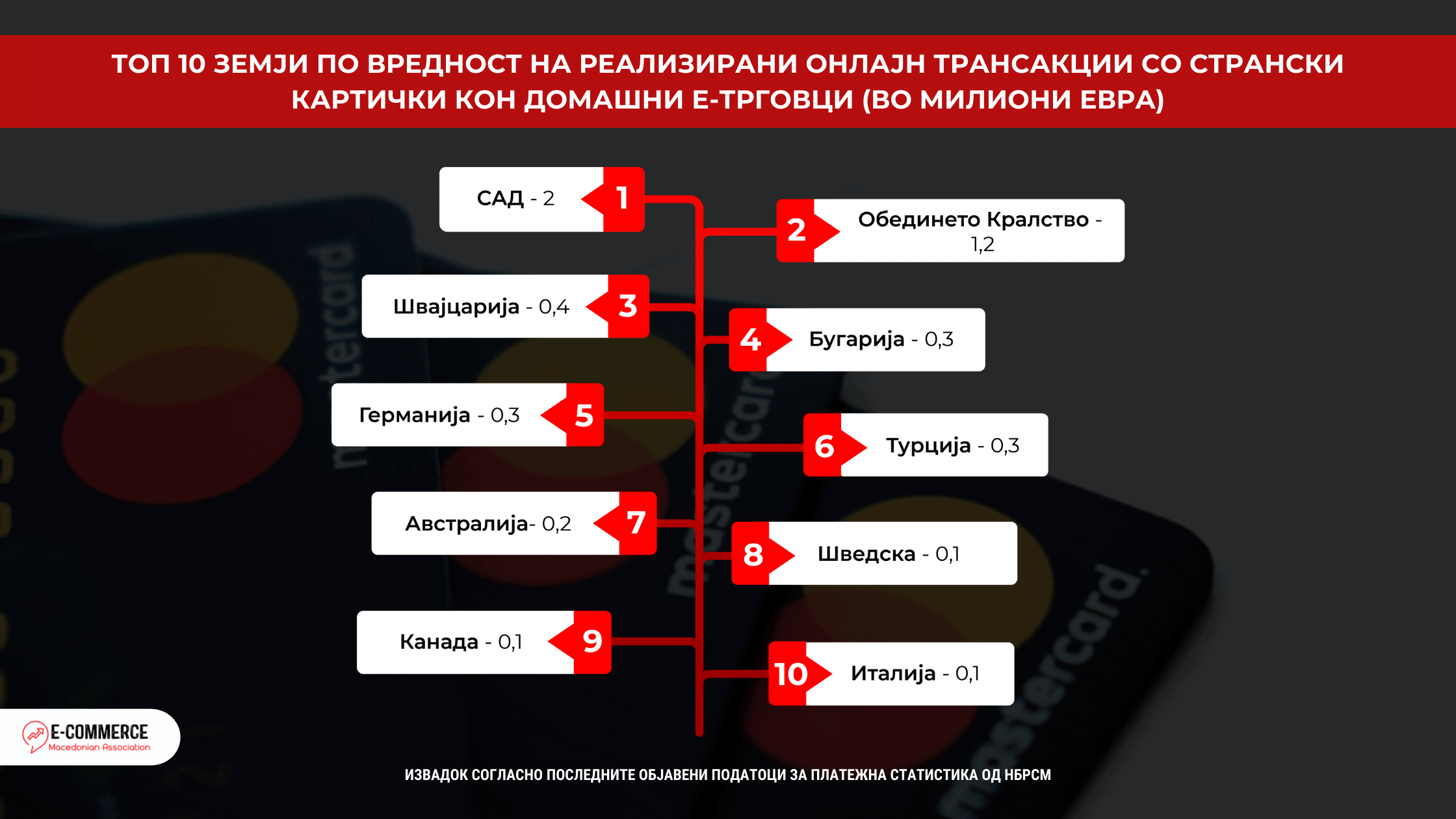 Од аспект на бројот на онлајн трансакции направени со странски платежни картички во Македонија, 45,1% од трансакциите завршиле во корист на ТОП 10 земјите прикажани во табелата во продолжение.