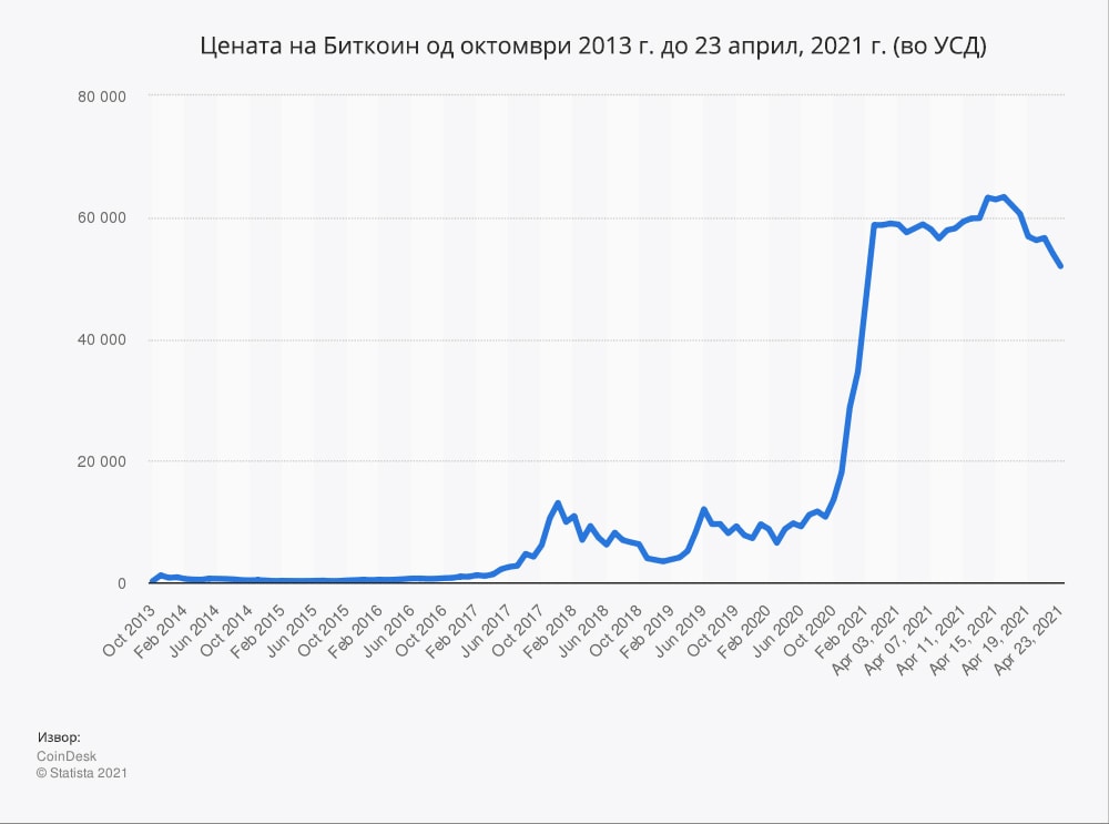 На графиконот подолу се гледа движењето на цената на биткоинот во период од 2013 година, до 23-ти април 2021. Трендот покажува дека 2017 година е клучна за размрдување на цената и нејзино движење нагоре. На крајот од 2017 го достигна тогаш неверојатното ниво од околу 16.000 УСД и со помали флуктуации се одржуваше на тоа ниво се до октомври 2020 година. До тогаш на пазарот имаше голем број на мали инвеститори, но пресвртот настана кога на сцена се приклучија големите корпорации. Цената драстично се зголеми до ниво кое надмина 60.000 УСД пред околу 10 дена. Она што е интересно за биткоинот е дека истиот е со “ограничено производство”, односно максималниот број на единици треба да се заокружи во наредните 5-6 години. Со влегувањето на големите инвеститори, а со тоа и нивните големи пропорции во вкупната маса, се претпоставува дека движењето на цената во голема мера ќе зависи од нивните продажби, а со тоа се зголемува и ризикот од голема волатилност.