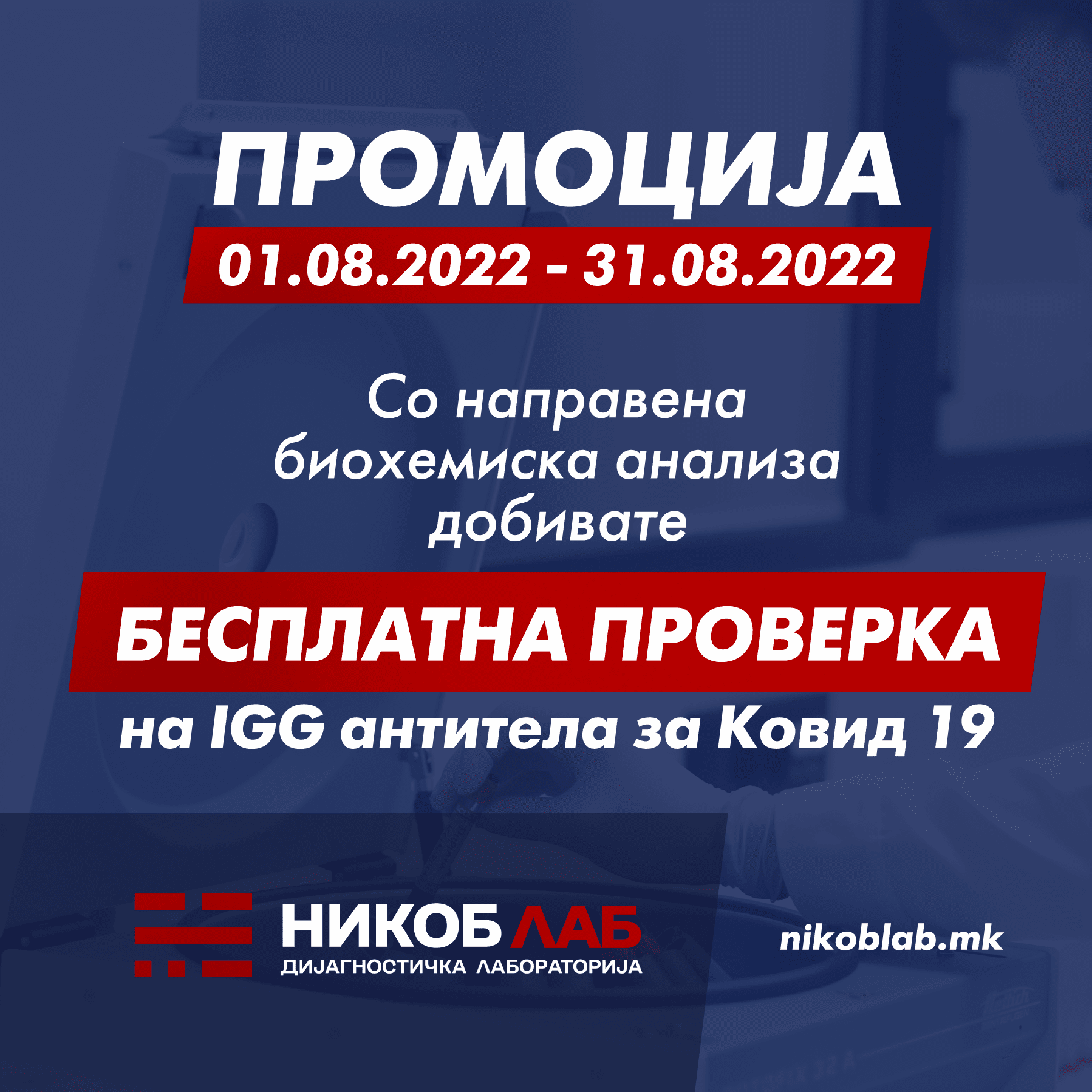 Бесплатниот скриниг и проверка за IgG антитела од Ковид 19 важи доколку во Никоб Лаб направите биохемиски анализи со Лабораториски упати ЛУ1-а, ЛУ1-б, ЛУ1-в и ЛУ2 од матичен доктор или специјалист преку мој термин, а ПЗУ Никоб Лаб има склучено договор со ФЗОСРМ за изработка на посочените биохемиски анализи по фондовски цени и услуги.
