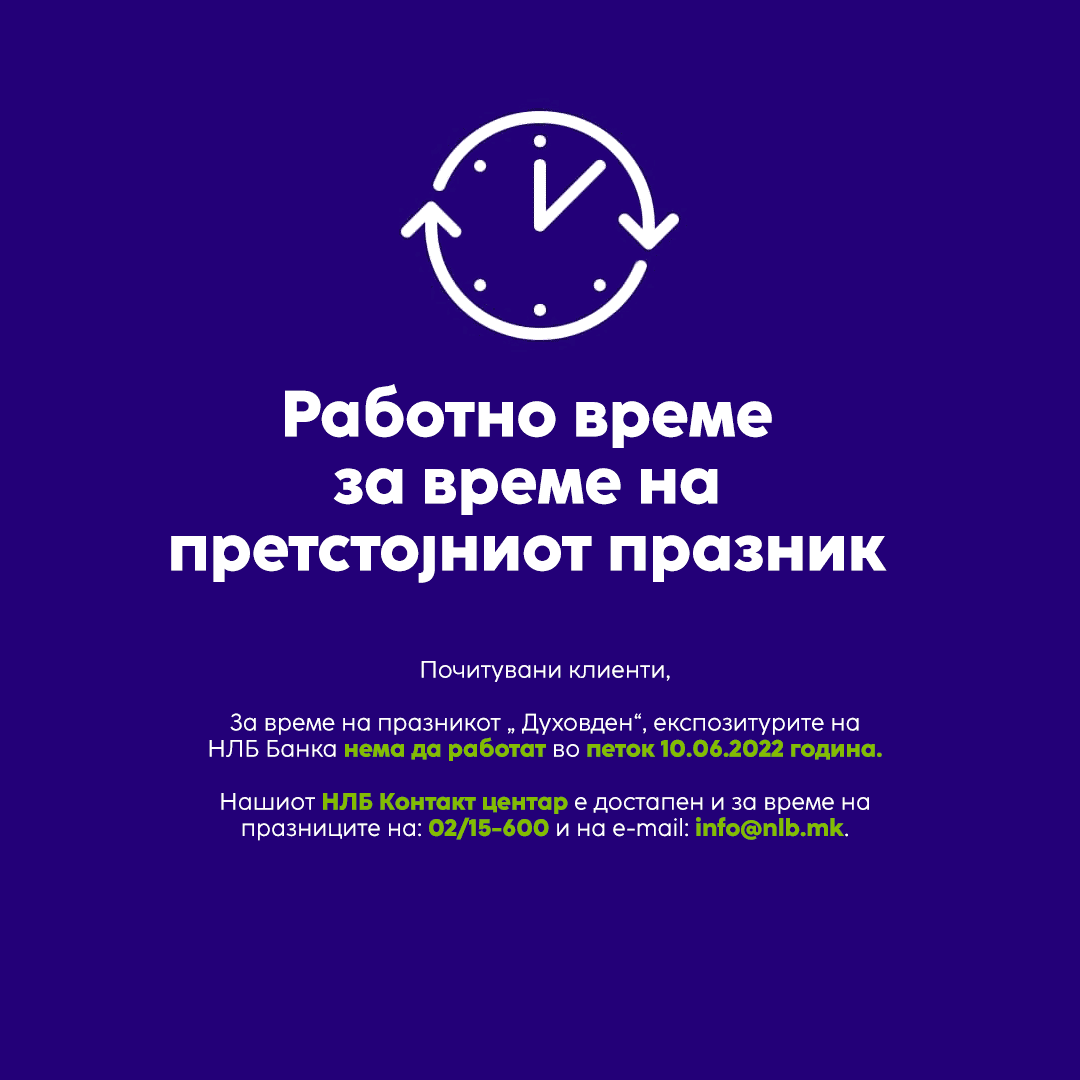 За време на празникот „ Духовден“, експозитурите на НЛБ Банка нема да работат во петок 10.06.2022 година.