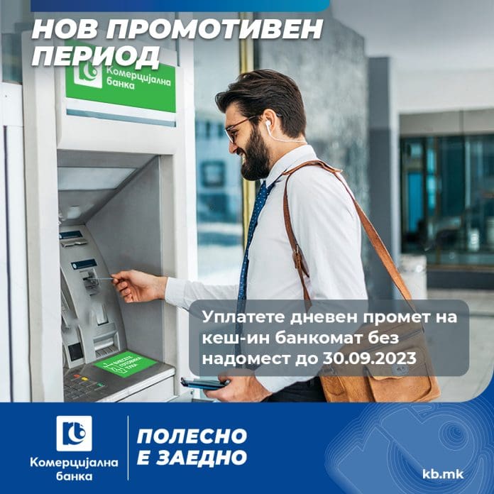 Искористете го новиот промотивен период до 30.09.2023 година за бесплатно да извршите уплата на дневен промет на cash-in банкоматите на Комерцијална банка.