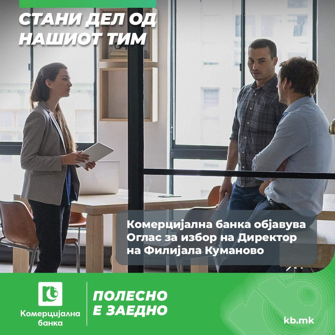 Имаш лидерски способности и менаџерски вештини, сакаш предизвици и тимска работа и се идентификуваш со визијата и мисијата на Банката. Ти нудиме можност за остварување на твоите професионални цели и амбиции со вработување во Комерцијална банка која е финансиска институција со долгогодишна традиција и која гради стабилност, ефикасност и иновативност со успешен и посветен тим на професионалци.