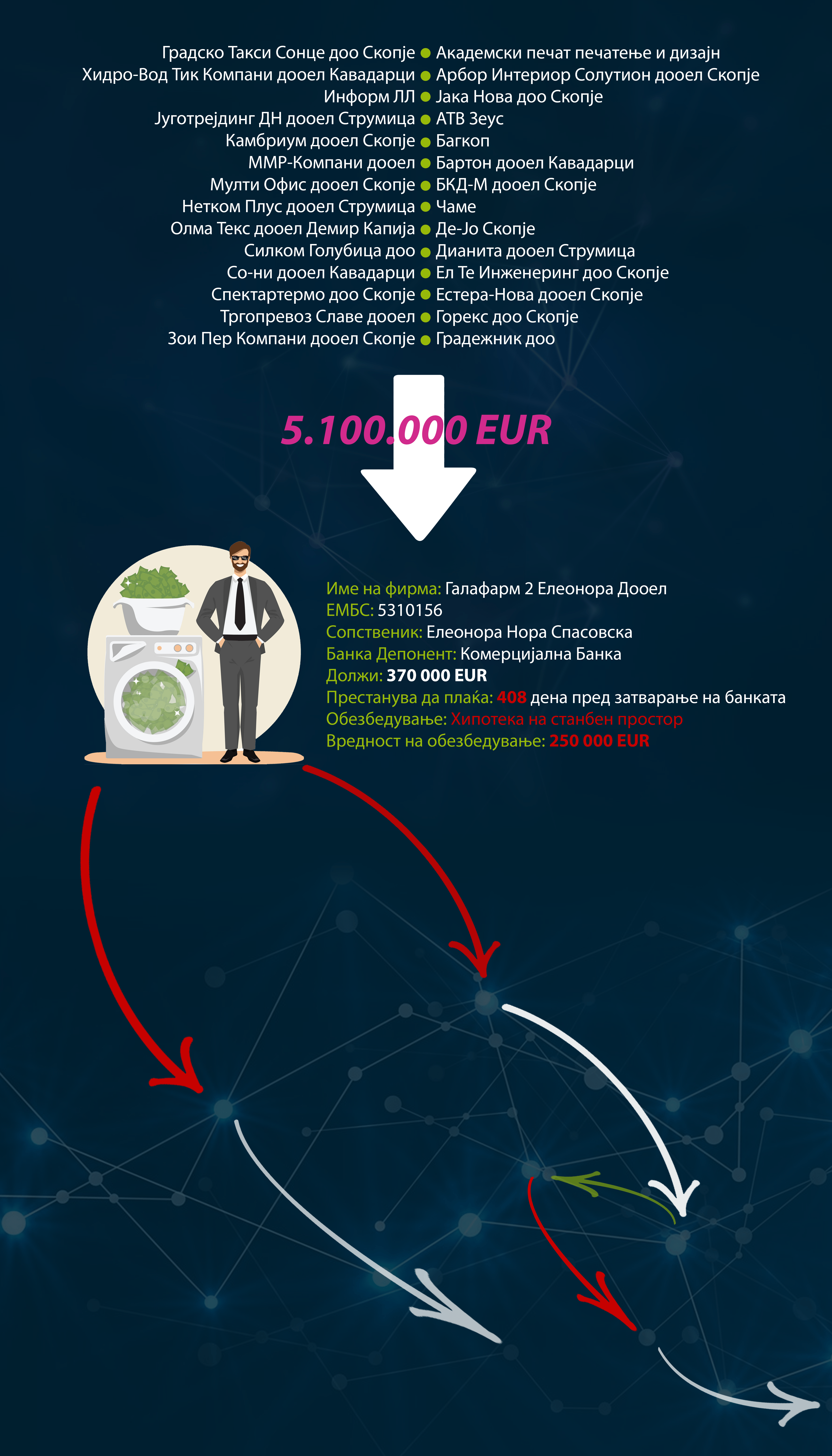 Како всушност се одвивал криминалот во Еуростандард банка ќе претставиме преку „Групацијата Галафарм”. Веќе посочивме дека долговите на четирите поврзани фирми во групацијата изнесуваат околу 2.550.000 евра. Меѓутоа, тоа е далеку од вистинската слика за реализираниот вистински грабеж преку оваа групација, поточно фирмите Галфарм и Галафарм 2 како носители на криминалот. Во овие фирми, преку трансакции во вид на позајмици од фирми должници во Еуростандард банка, завршиле дополнителни околу 5.670.000 евра. Со тоа, вкупната загуба односно покрадени и проневерени наши парични средства изнесува околу 8.220.000 евра. Значи, освен што фирмите од Групацијата Галафарм, и тоа: Галафарм, Галафарм 2, Де-Јо Јован и Информ ЛЛ се директни должници према Еуростандард банка, во фирмите Галафарм и Галафарм 2 завршиле дополнителни наши парични средства. Тие пари биле трансферирани од други фирми директни должници кон Еуростандард банка, во вид на доделени „позајмици” кон фирмите Галафарм и Галафарм 2. Па така, до крајот на 2019 година, документите говорат дека Галафарм 2 добила „позајмици” од 30 фирми директни должници кон Еуростадард банка во вкупен износ од околу 5.100.000 евра, додека Галафарм добила „позајмици” од 3 фирми должници во вкупен изнод од околу 570.000 евра. Сето ова е организирано за да всушност се сокрие трагата на парите, со намера да тие завршат во туѓи џебови како што во основа и се договориле актерите во криминалот со високото раководство на ограбената банка. Тоа е основата на која почива организираниот криминал и корупција во Еуростандард банка, за којшто сведочат мноштво случаи, а Групацијата Галафарм е еден од позначајните водечки примери на сторениот масовен грабеж на депозитите во банката, се вели во денешното соопштение на здружението на оштетените штедачи на Еуростандард банката Правда за штедачи.