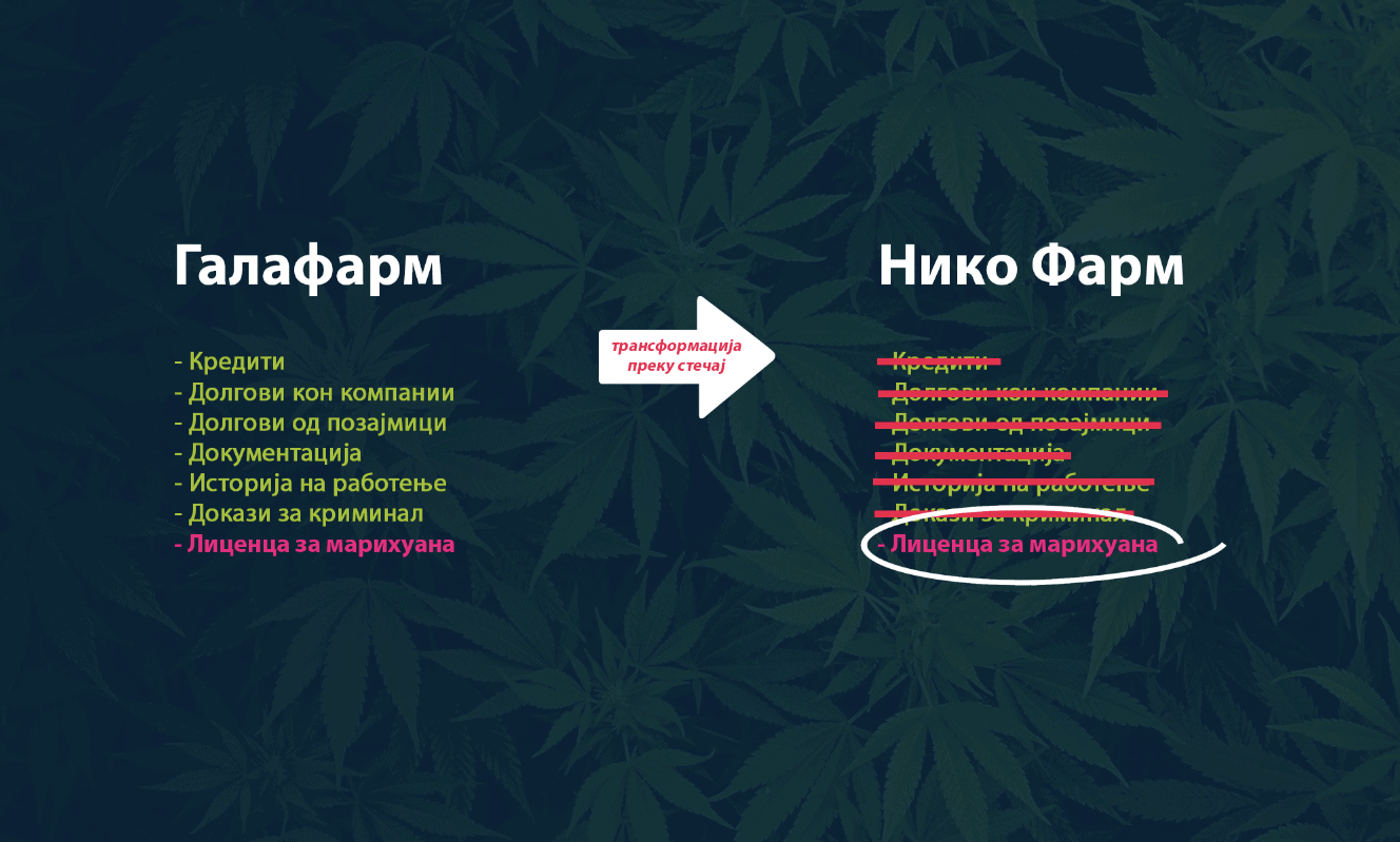 Фирмата за трговија и услуги Нико Фарм ДООЕЛ Скопје се јавува како заинтересирана страна за добивање на лиценцата за марихуана за медицински цели која ја поседува фирмата должник Галафарм. Оваа фирма Нико Фарм е основана на 28 септември 2020 година со депонентна сметка во Комерцијална банка, кус период после затворање на Еуростандард банка во август минатата година. Фирмата е со седиште во општина Кисела Вода во Скопје и е основана со паричен влог од 5.000 евра. Сопственик и управител на фирмата е Николај Иванов Хинтоларски. Веднаш после основањето, фирмата се стекнува со сопственост над сите недвижности како и дел од подвижниот имот на фирмата Галафарм. Се чини дека единствено што недостасува е лиценцата за марихуана за медицински цели во поседување на Галафарм. Меѓутоа, Галафарм е должник во Еуростандард банка и има обврска да ги врати парите кои ги земала од банката односно парите од депозитите на доверителите, се вели во денешното соопштение на здружението на оштетените штедачи на Еуростандард банката.