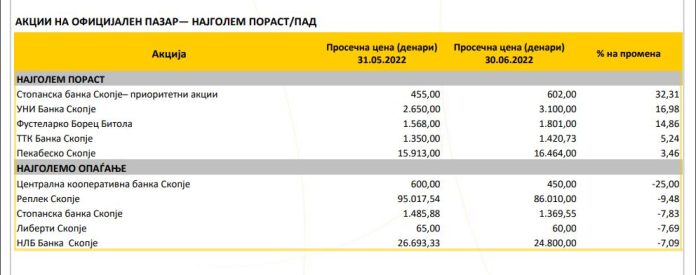 Приоритетните акции на Стопанска банка Скопје, како и акциите на УНИ Банка Скопје, Фустеларко Борец Битола, ТТК Банка Скопје и Пекабеско Скопје се акции со најголем пораст во месец јуни на Македонска берза.