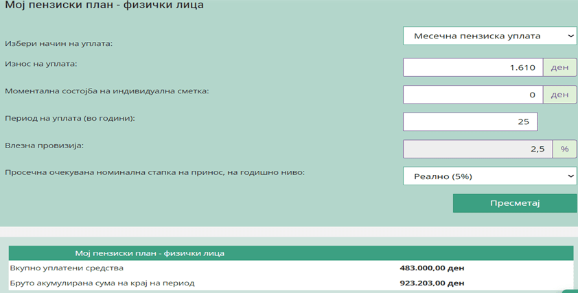 Под претпоставка секој месец да уплаќате 1610 денари во текот на 25 години, при влезна провизија од 2,5% и просечна реална очекувана номинална стапка на принос на годишно ниво од 5%, Вие би имале вкупно уплатени средства од 483.000 денари, а бруто акумулирана сума на крај на период од 923.203 денари.