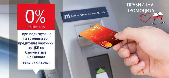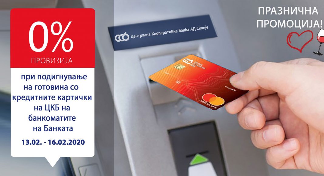 Централна кооперативна Банка АД Скопје ги известува своите клиенти, дека во периодот од 13.02.2020 година до 16.02.2020 година, при подигнување на готовина со кредитните картички за физички лица издадени од ЦКБ АД Скопје, на банкоматите на Банката, провизијата ќе биде 0%.