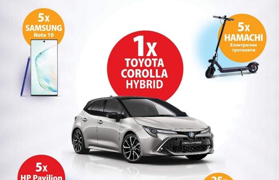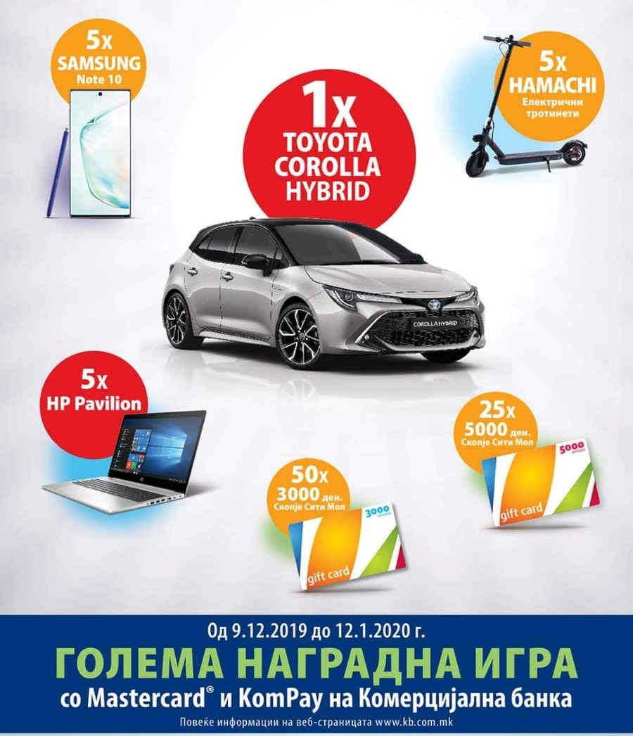 Главната награда, Toyota Corolla Hybrid, ќе ја доделиме на главното извлекување на 22 јануари 2020 година, а во меѓувреме секоја недела ќе доделуваме по 1 (еден) смартфон Samsung Note 10, 1 (еден) лаптоп HP Pavilion i7, 1 (еден) електричен тротинет Hamachi, 5 (пет) гифт-картички за трговскиот центар „Скопје Сити Мол“ во вредност од 5.000 денари и 10 (десет) гифт-картички во вредност од 3.000 денари.