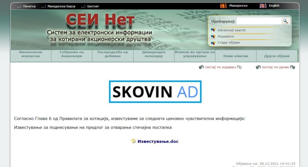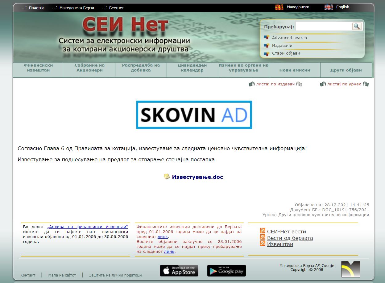Исто така, податоците уште еднаш нагласуваме за работата на Сковин АД Скопје се преземени од Македонска берза. Во однос на фотографијата се извинуваме за нејзиното преземање и доколку довела до забуна и веднаш ќе биде отстранета од текстот.