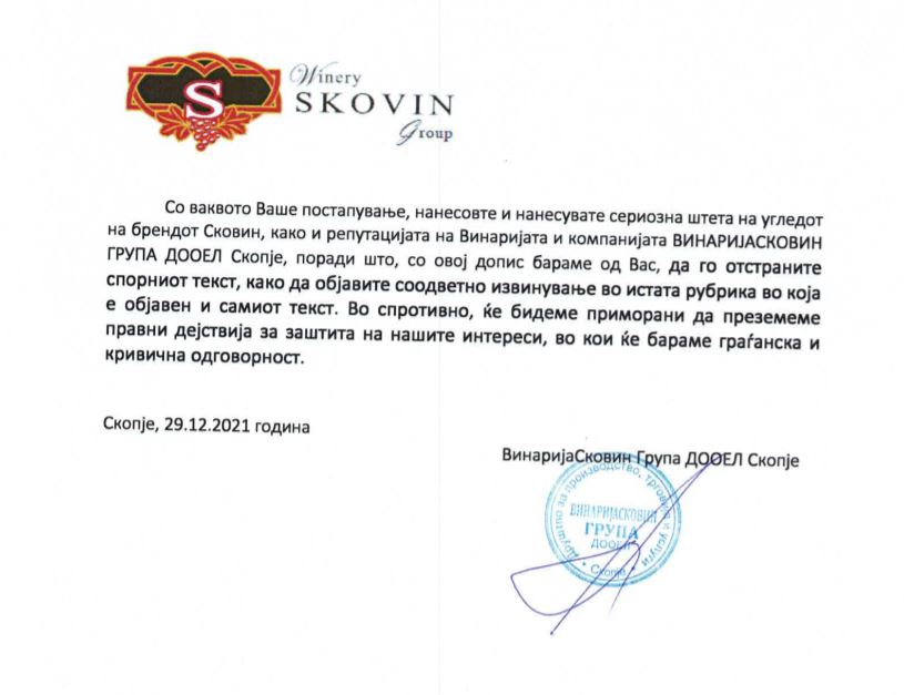 Редакцијата Пари во текстот ,,Сковин оди во стечај, колку загуби направи винаријата лани?” информацијата за стечајот на оваа компанија ја презема од официјална објава од менаџерскиот тим на Сковин АД Скопје на Македонска берза, а може да се прочита на следниот линк. Станува збор за информација која се однесува исклучиво за компанијата Сковин АД Скопје како што е објавено и на берза (регистрирана на адреса 15-ти Корпус 2 Гази Баба), а не и на ВИНАРИЈАСКОВИН ГРУПА ДООЕЛ која бара извинување за објавената информација ( со адреса 15-ти Корпус 3 Гази Баба).