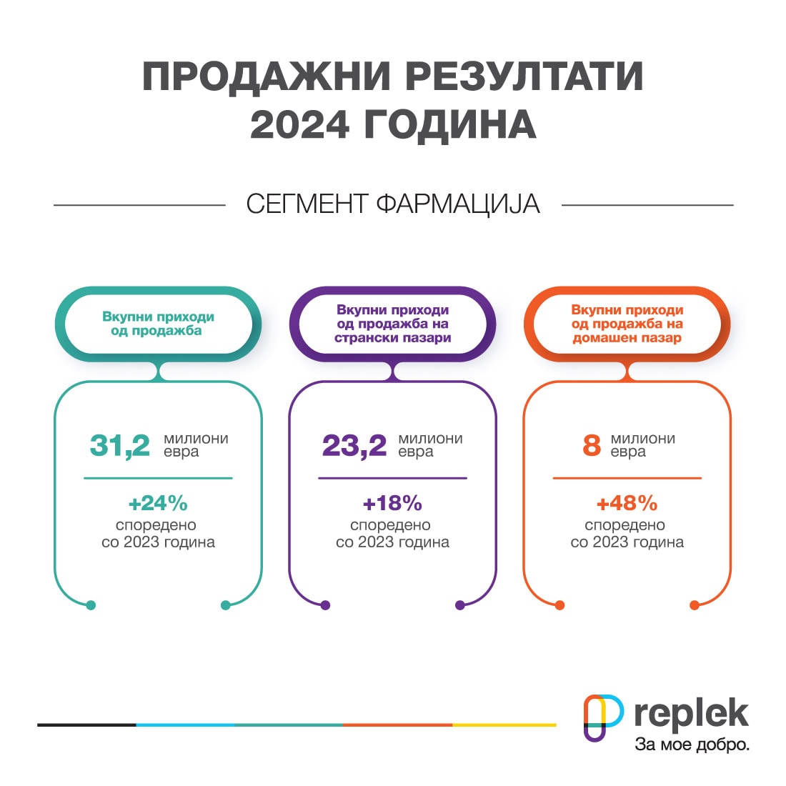 Во текот на 2024 година компанијата Реплек АД го задржа трендот на пораст на приходите од продажба забележан претходните две години, надминувајќи ги проектираните цели од годишниот бизнис план со реализација од 100,5%. За периодот од 1. јануари до 31. декември 2024 година, остварени се вкупни приходи од продажба од 1.919,6 милиони денари (31,2 милиони евра), што претставува раст од 24% во споредба со претходната година.
