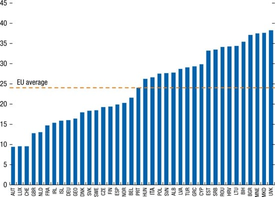 Од податоците на ММФ може да се види дека најниско ниво на сива економија има во Австрија – 9,4 проценти, а на слично ниво, односно 9,6 проценти е сивата економија на Швајцарија и на Луксембург. Од земјите на поранешна Југославија, Црна Гора е веднаш зад нас со сива економија од 37,5%. Босна и Херцеговина има сива економија од 35,4%, Србија – 33,5%, Хрватска – 34,2% (највиск процент на земја членка во ЕУ) и Словенија има сива економија од 27,7 %. Просекот во ЕУ е 22,9%