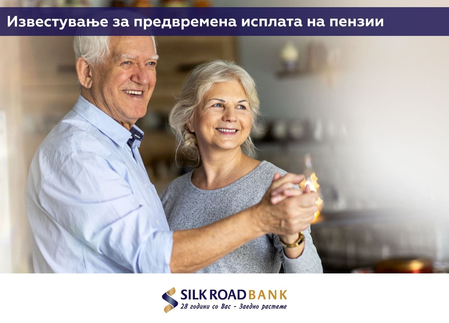Силк Роуд Банка АД Скопје ги известува сите приматели на пензија преку Банката дека предвремената исплата на пензиите за месец мај ќе се врши на 26.05.2021 година (среда). Почнувајќи од 26.05.2021 година пензиите ќе може да се подигнат со платежна картичка од било кој банкомат на банката.
