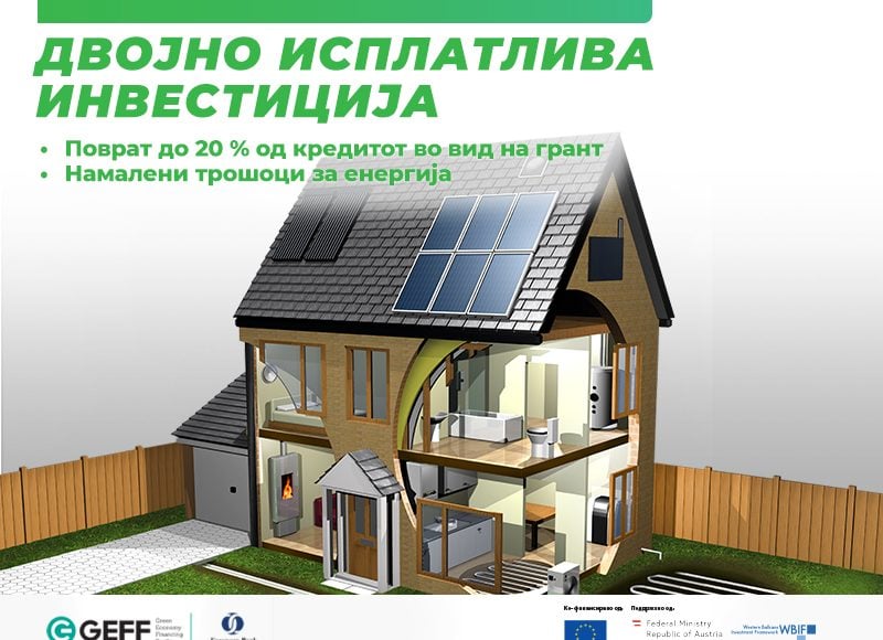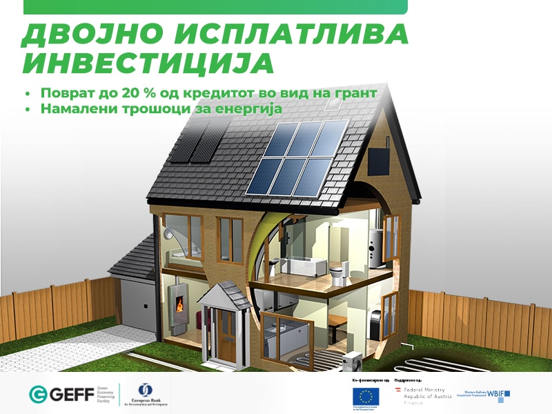 Инвестициите во енергетски ефикасен дом се повеќе од исплатливи со кредитот на Комерцијална банка, кој ви овозможува поврат до 20% од кредитот во вид на грант обезбеден од Европска Унија и одлична каматна стапка од 4,4% годишно. Кредитот е со износ до 50.000 евра и со рок на отплата до 20 години, а е наменет за набавка и инсталација на енергетски ефикасни прозорци, врати и застаклување, изолација на надворешни ѕидови, покрив, поткровје, под, преградни ѕидови, набавка на печки/котли на биомаса, котли на гас, соларни колектори за топла вода, фотоволтаични системи, топлински пумпи, високоефикасно и нискотемпературно осветлување, балансирана механичка вентилација, акумулациски бојлери за топла вода.