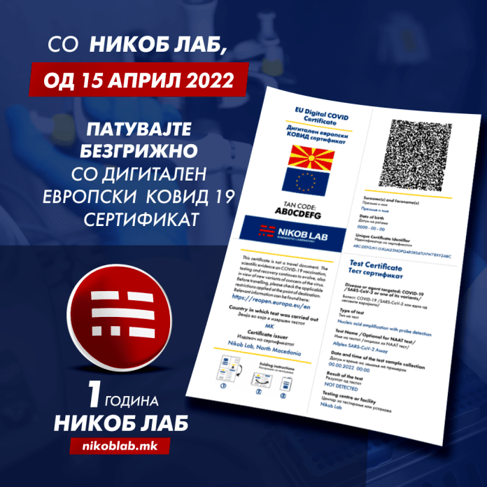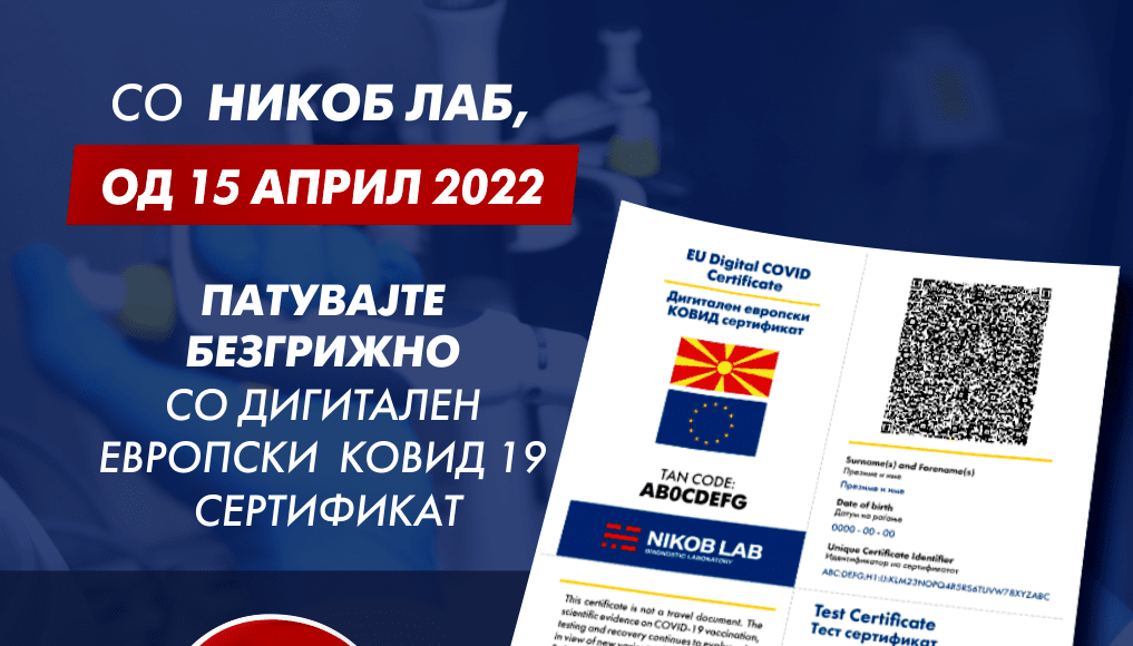 Со цел безбедно и непречено да патувате во Европа и светот, од денес во НИКОБ ЛАБ во истата цена со секој направен ПЦР или брз антигенски тест, добивате и EU/DCC – Digital Covid Certificate.