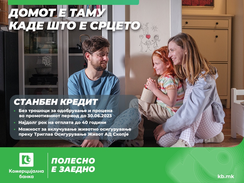 Новиот дом нека биде новата радост за целото семејство. Со Станбениот кредит на Комерцијална банка, сега и без трошоци за одобрување и процена во промотивниот период до 30.06.2023, обезбедете си нов дом и уживајте во привилегијата да имате најниска месечна рата, информираат од Банката.